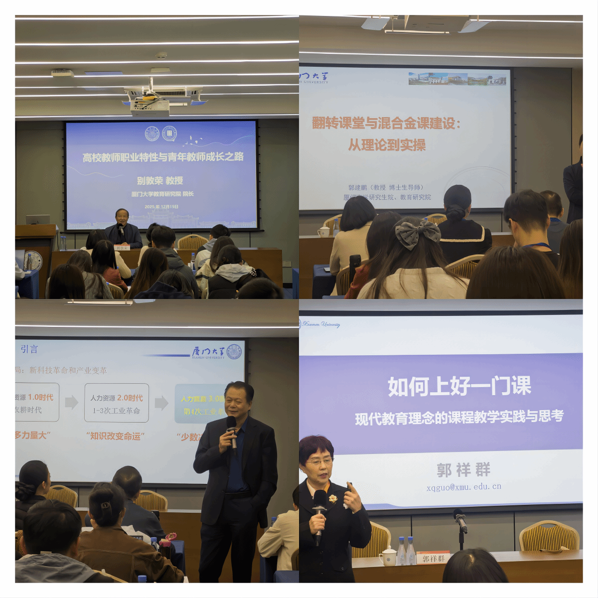 研修班特邀厦门大学多位资深专家学者进行专题授课。课程内容立足学科前沿、紧扣教学实际,兼具指导性与实用性。厦门大学研究生院副院长郭建鹏教授以《翻转课堂与混合金课的理论与实践》为题,系统阐释“O-PIRTAS”翻转教学模式,围绕目标、准备、视频、回顾、测试、活动、总结七个环节,为青年教师提供了一套清晰可行的教学实施路径;教师发展中心主任计国君教授在《数字化驱动下大学教育教学设计》专题中提出,教师应着力培养学生的价值观、创意思维等人工智能难以替代的核心素养,为青年教师应对数字时代教学变革指明了方向。数学科学学院杜妮教授结合《高等代数》国家级一流本科课程建设经验,系统阐述从“讲好一节课”到“建好一门课”的实践路径,分享了知识图谱、AI助教、混合式教学等创新手段对提升教学质量的积极作用;教育研究院院长别敦荣教授深入解读“高校教师职业特性与青年教师成长之路”,强调高校教师在人才培养、科学研究、社会服务与文化传承中的多元使命,为青年教师职业发展提供了重要参照;化学化工学院郭祥群教授围绕“如何上好一门课”展开实操指导,聚焦教学设计关键环节,为青年教师备战教学竞赛提供宝贵建议。此外,研修班还组织参访了厦门大学鲁迅纪念馆与校史馆,实地感悟厦门大学的校园文化与历史底蕴。
