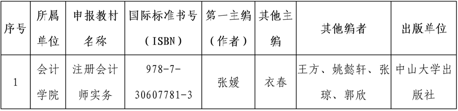 根据《教育部办公厅关于开展普通高等教育本科国家级规划教材推荐工作的通知》(教高厅函〔2025〕20号)和《广东省教育厅关于开展“十四五”普通高等教育本科国家级规划教材第二次推荐遴选工作的通知》要求,经个人申报、教学单位推荐、学校审议,拟推荐张媛老师主编的《注册会计师实务》报送省教育厅,现予以公示。